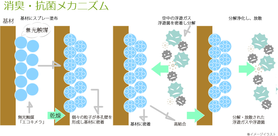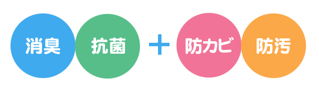 | 効能 | 主効果:硫化水素・ホルムアルデヒド・アンモニアなどの消臭 副効果:防カビ・防汚 | |
